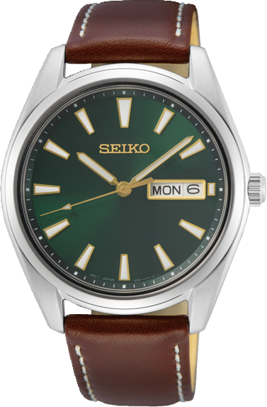 Het Seiko SUR449P1 Herenhorloge heeft een edelstalen kast, een bruine leren band en een groene wijzerplaat. Dit rustige model heeft met zijn eenvoudige wijzerplaat een sportieve uitstraling.