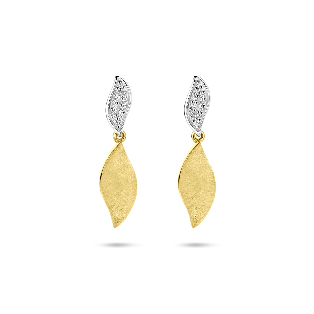 Gouden oorhangers in 14 karaat geel en witgoud.