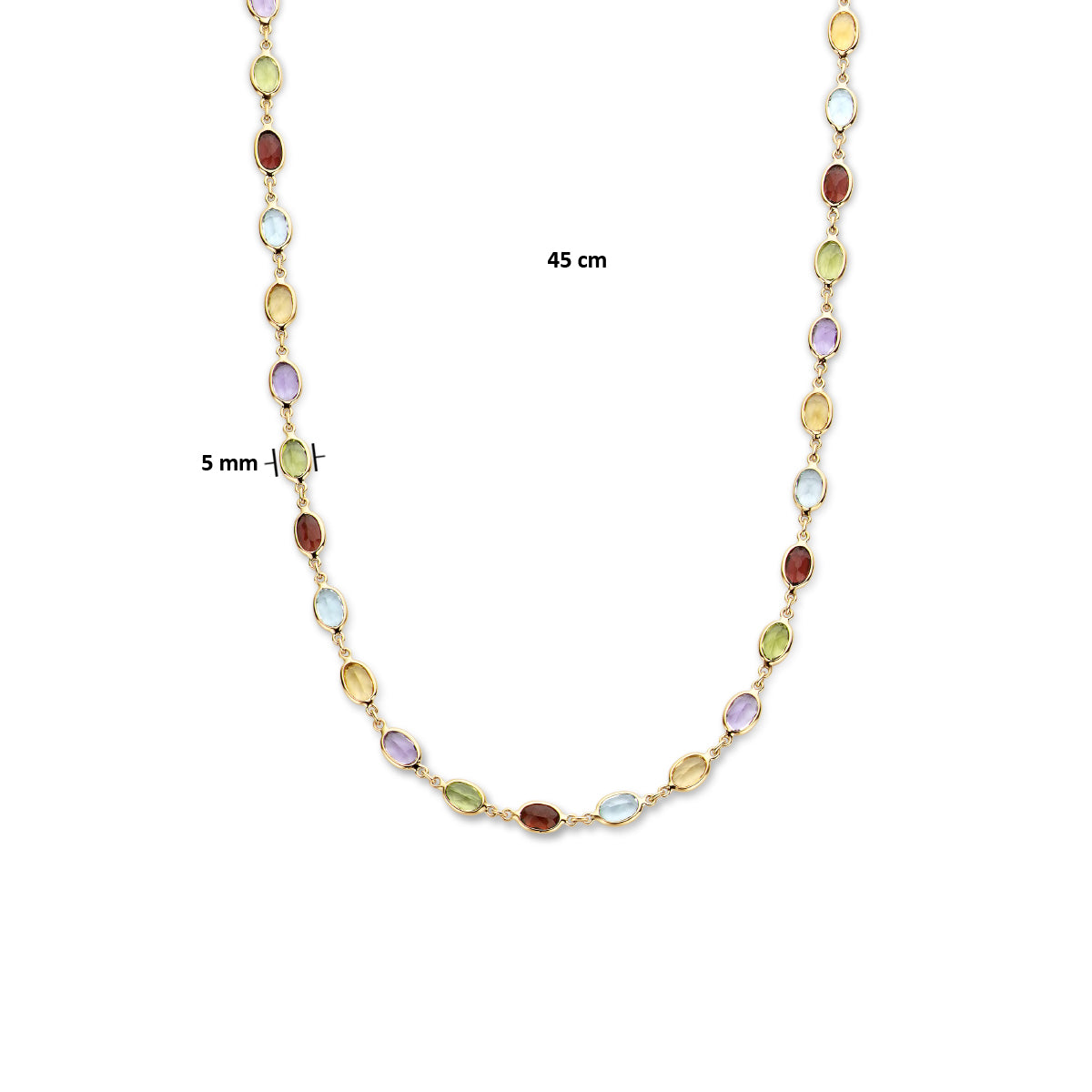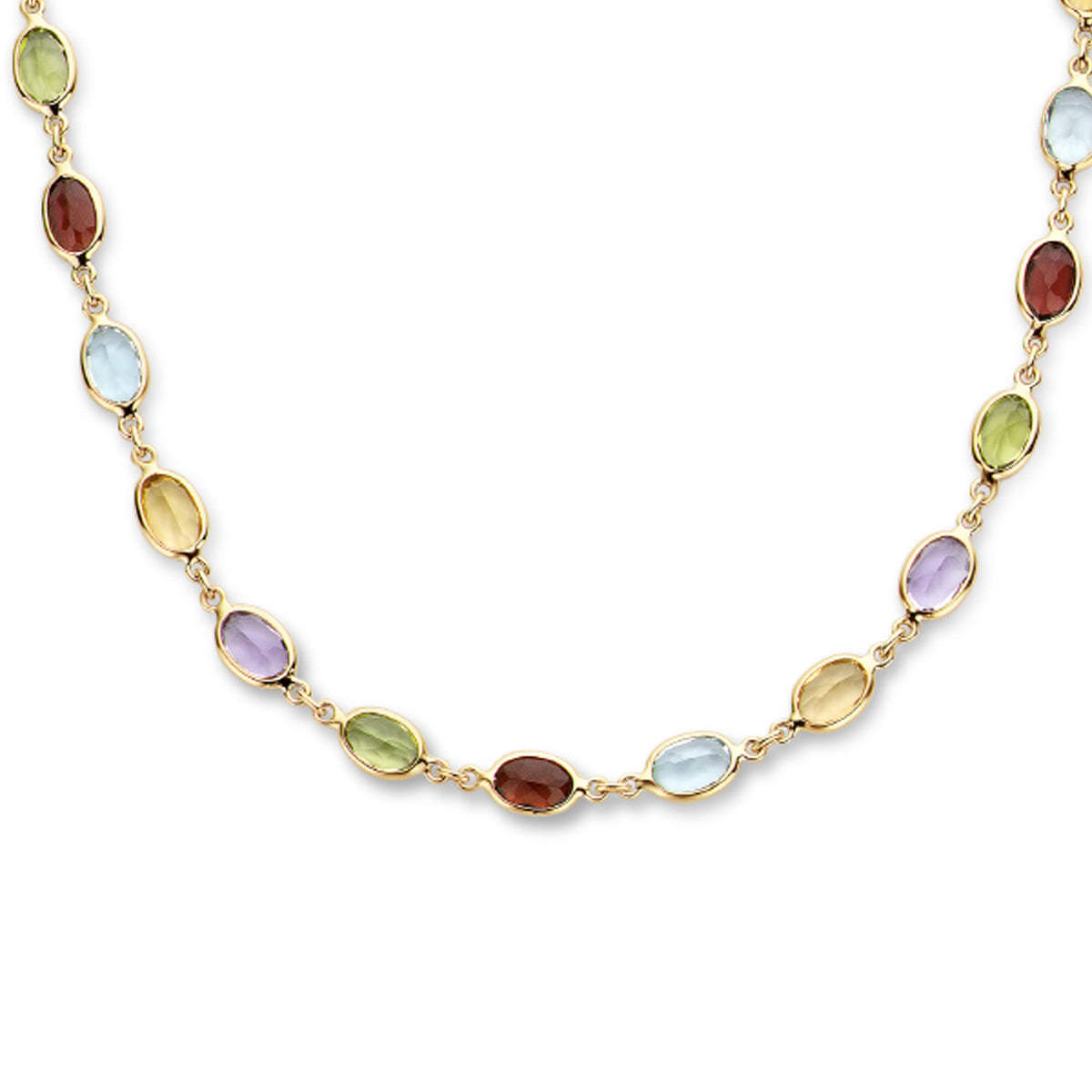 14k Geelgouden collier met verschillende edelstenen. De totaal steengegwicht van: amethist 3.25ct, citrien 3.50ct, blauw topaas 4.55ct, granaat 4.00ct en de peridot 3.55ct. Het collier heeft een draaglengte van 45cm. Uitgevoerd met een karabijn sluiting.